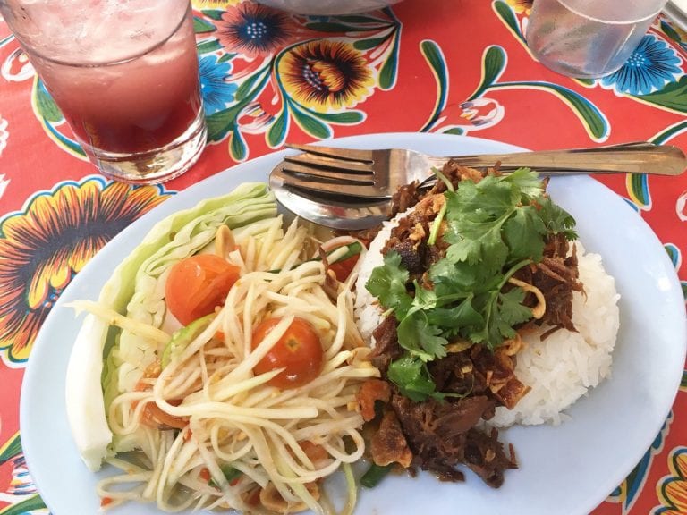 Tayland mutfağının en bilinen ve en sık tüketilen yemeklerinden birisi olan Som Tam, şehrin hemen her yerinde bulunuyor. Soyulmuş papayaya ek olarak palmiye sosu, havuç, fıstık, domates, balık sosu, çalı fasulyesi ve biber havan içinde dövülmesi ile hazırlanıyor. Gün boyunca aynı havan kullanılarak hazırlanan bu geleneksel yemeği akşam saatlerinde yiyecekseniz üzerine ek acı ilave etmeyebilirsiniz.