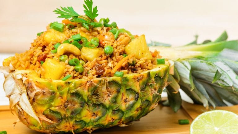 Kim bilebilirdi ananasın kırımızı et, tavuk ya da karidesle buluştuğunda ortaya mükemmel bir lezzet çıkacağını? Taylandlılar ağızda tatlı-ekşi bir tat bırakan harika lezzeti sarımsak ve soya sosu ile lezzetlendiriyorlar. Et yemeyi tercih etmezseniz sebzeli seçenekleri de bulunuyor.